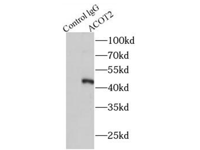 ![]() 將3ug FNab00091(ACOT2抗體)以1:500稀釋度,使用2000ug的HepG2細(xì)胞裂解液進行免疫沉淀實驗而獲取的結(jié)果。